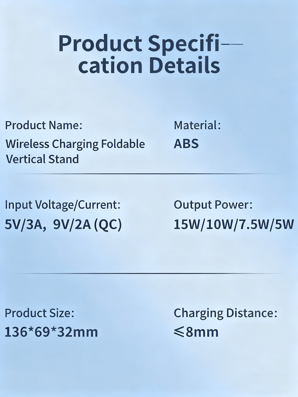 Featuring a magnetic and foldable design, it allows easy positioning for hands-free use and convenient portability (136×69×32mm). With QC 5V/3A or 9V/2A input and a charging distance ≤8mm, it delivers stable and efficient charging wherever you go.