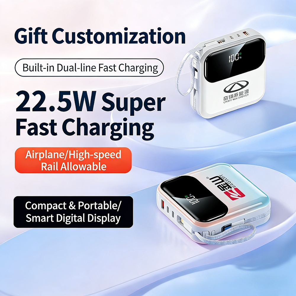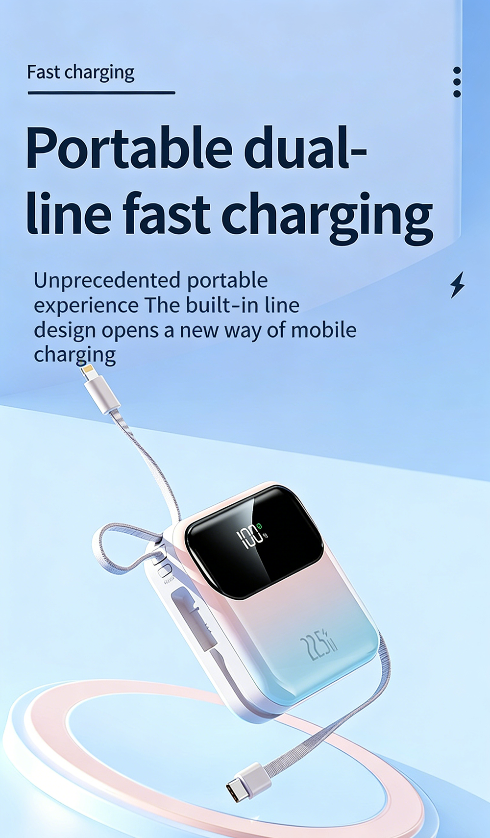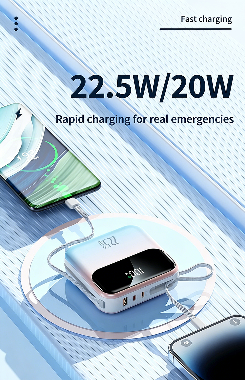 This compact 22.5W PD super fast-charging power bank is designed for effortless everyday use and professional gifting. Featuring built-in charging cables, it eliminates the need to carry extra cords, making it perfect for travel, work, and emergency power needs.