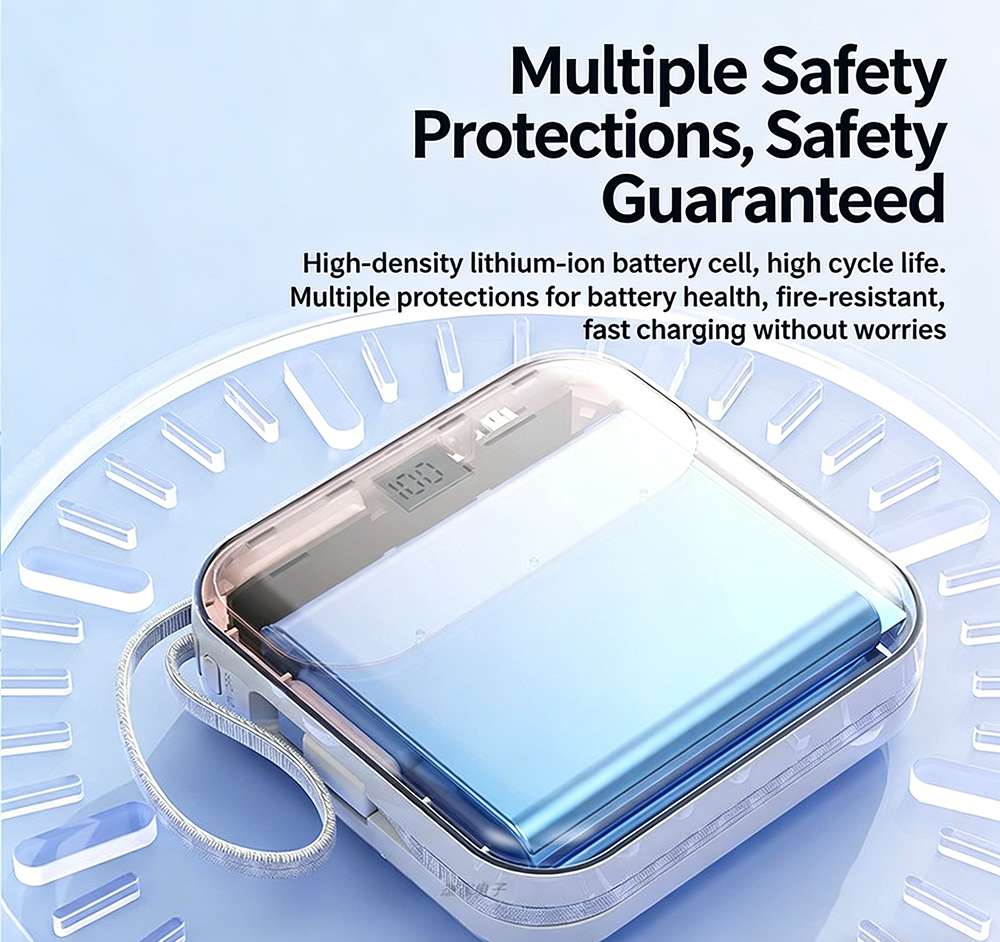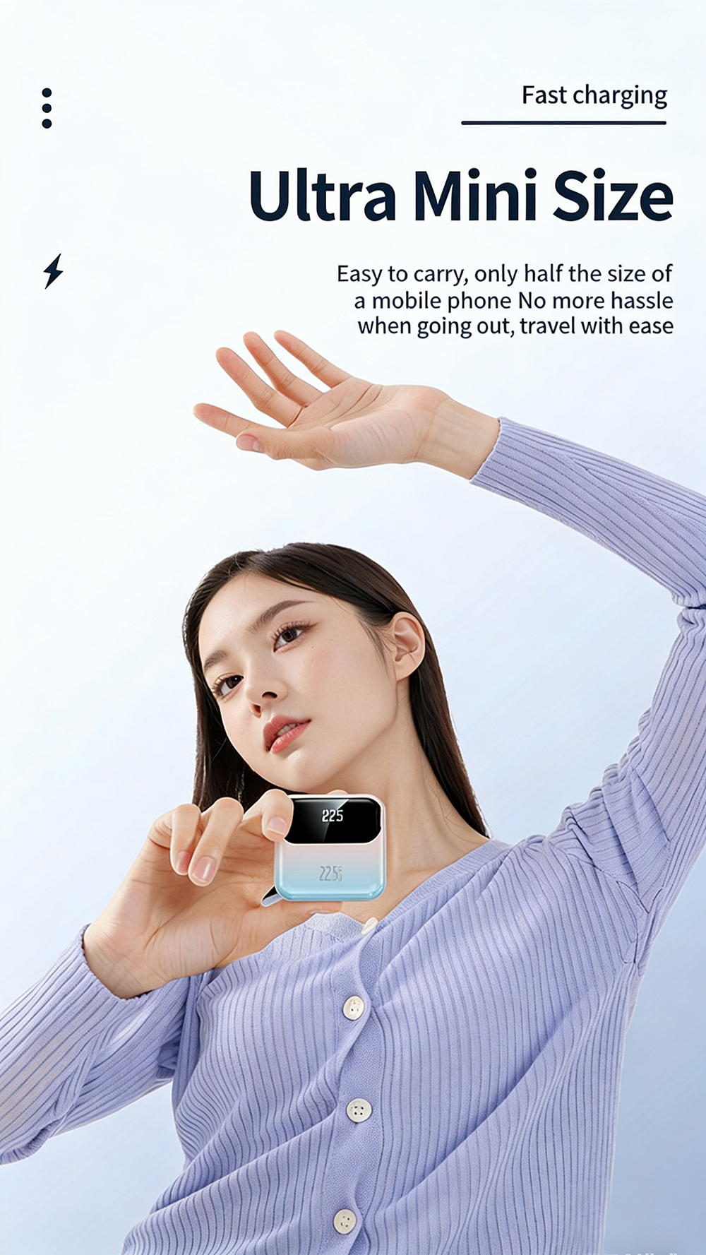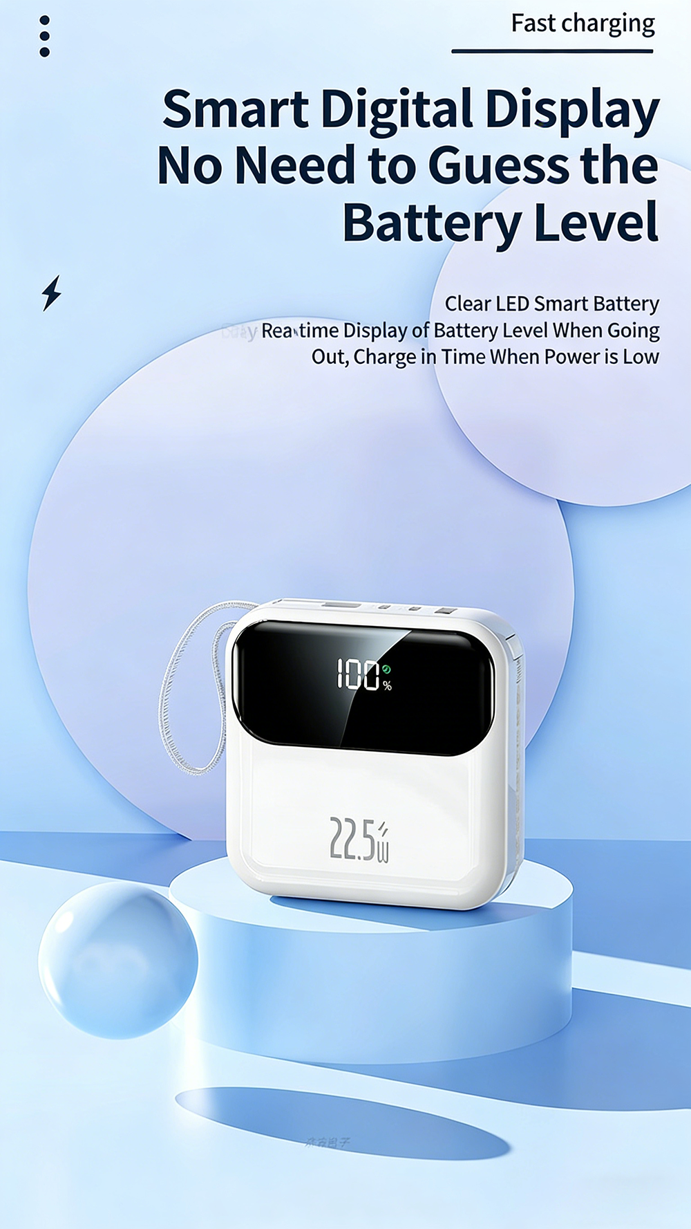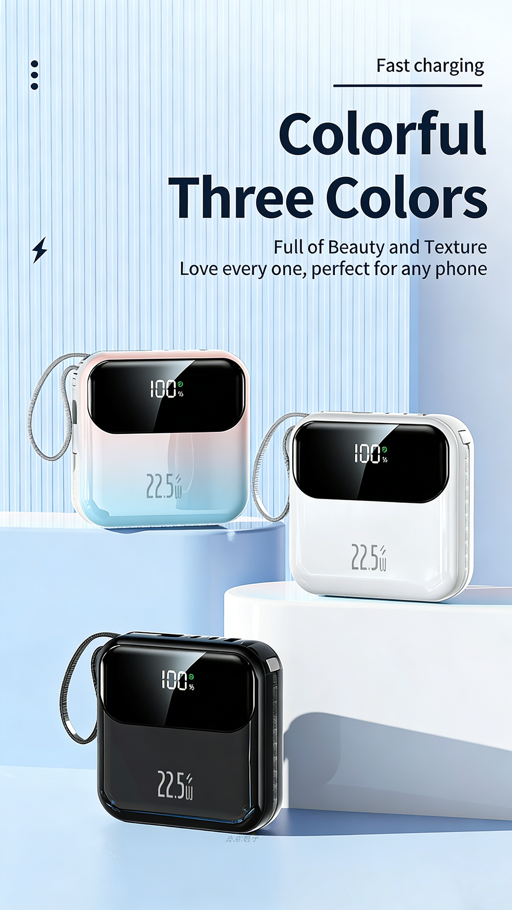 This compact 22.5W PD super fast-charging power bank is designed for effortless everyday use and professional gifting. Featuring built-in charging cables, it eliminates the need to carry extra cords, making it perfect for travel, work, and emergency power needs.